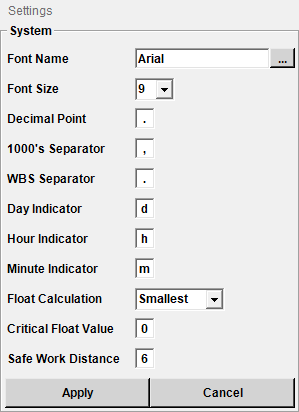 A text field containing the character to be used to define the 'Day' element of the Duration, Total Float and Lead/Lag